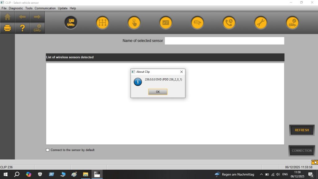 Open CAN Clip from the desktop. On the main screen, select Diagnosis and choose your vehicle brand. Connect the CAN Clip cable to the vehicle’s OBD2 port (typically under the dashboard, driver’s side) and turn the ignition to position II. CAN Clip reads the VIN automatically and populates the system list.