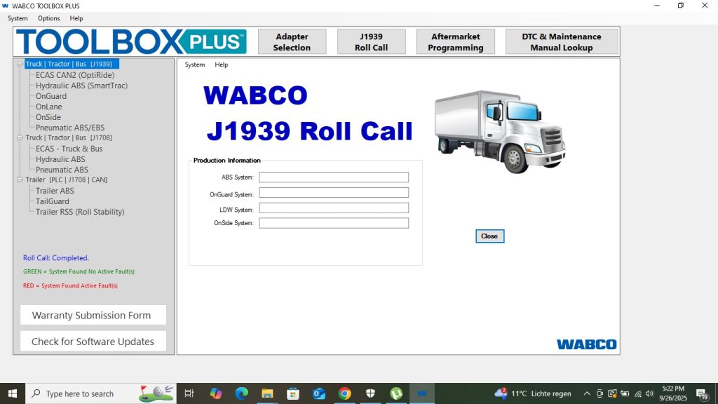 Connect the interface to the vehicle’s 9-pin Deutsch port (trucks) or the ISO 7638 connector on trailer ABS systems. Turn the ignition to On and launch Toolbox. Select Automatic System Detection — Toolbox will scan all available CAN and K-Line networks and identify every WABCO ECU present.
